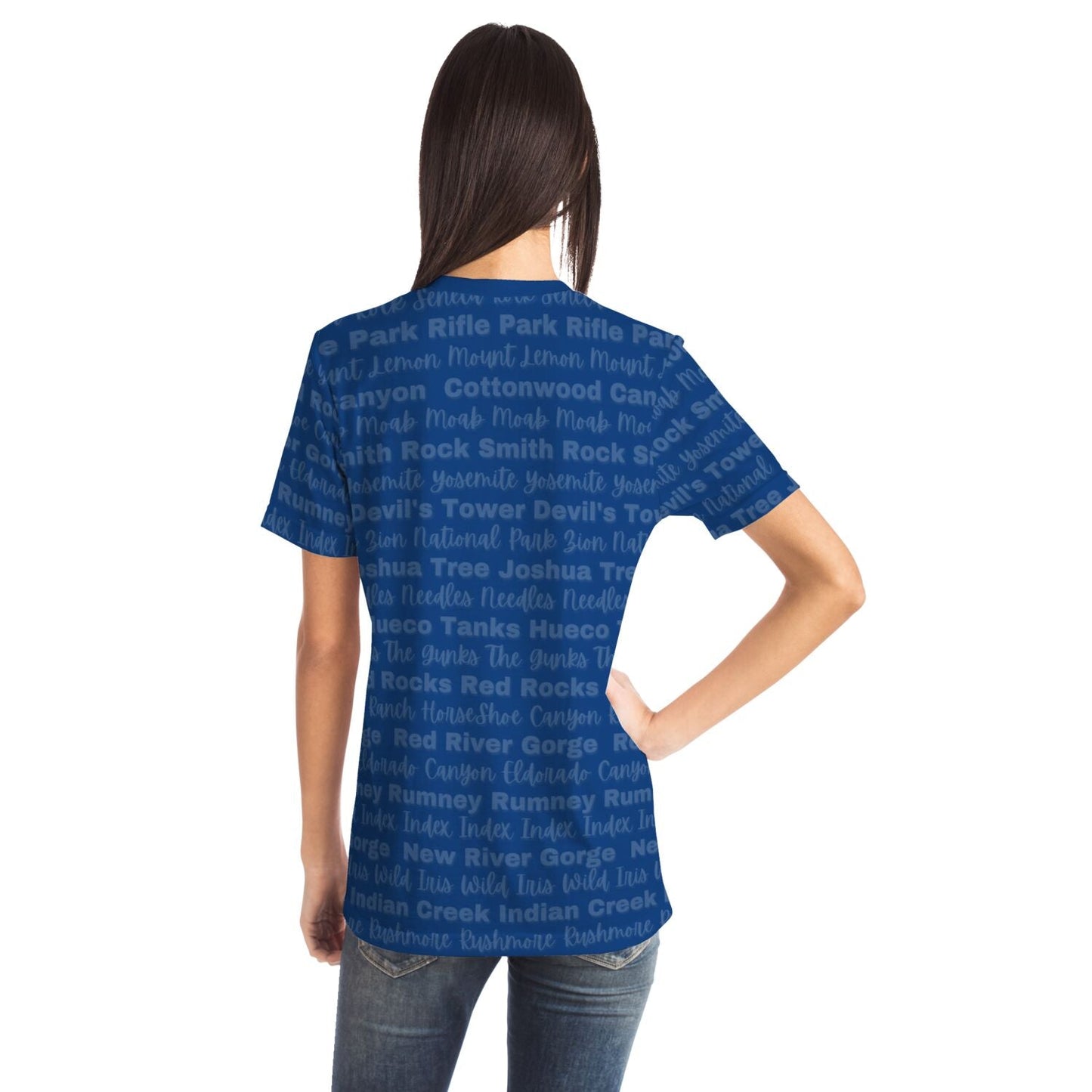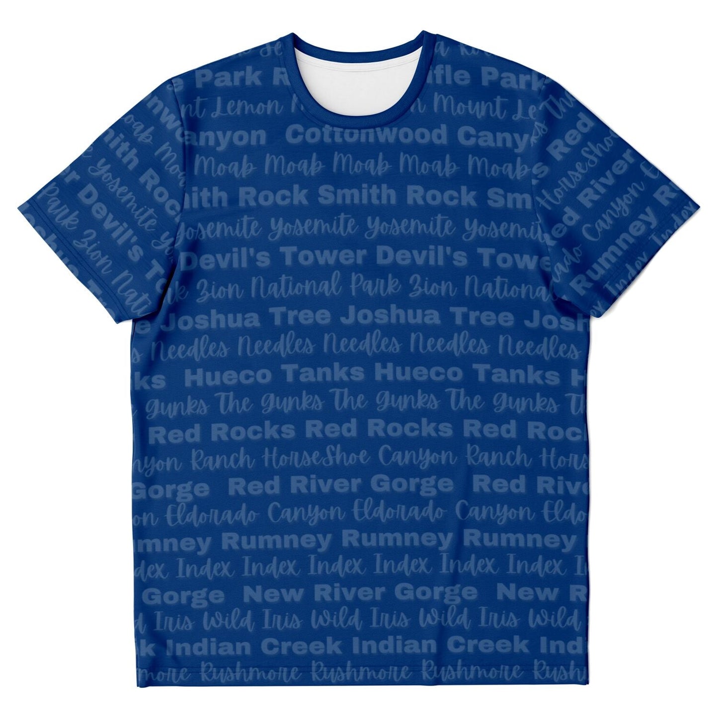 The Famous US Climbing Area Shirt is perfect for avid rock climbers! The fabric for this t-shirt subtly shows off the world class climbing locations from The Gunks to Zion and everything in between. The design makes for a great bucket list or just a conversation starter. The t-shirt is made with high-quality materials that are soft, durable, and breathable, making it perfect for wearing during climbing sessions or everyday wear. Whether you're scaling the walls at the New, climbing in the gym, or just lounging around, this t-shirt is the perfect addition to your climbing wardrobe.